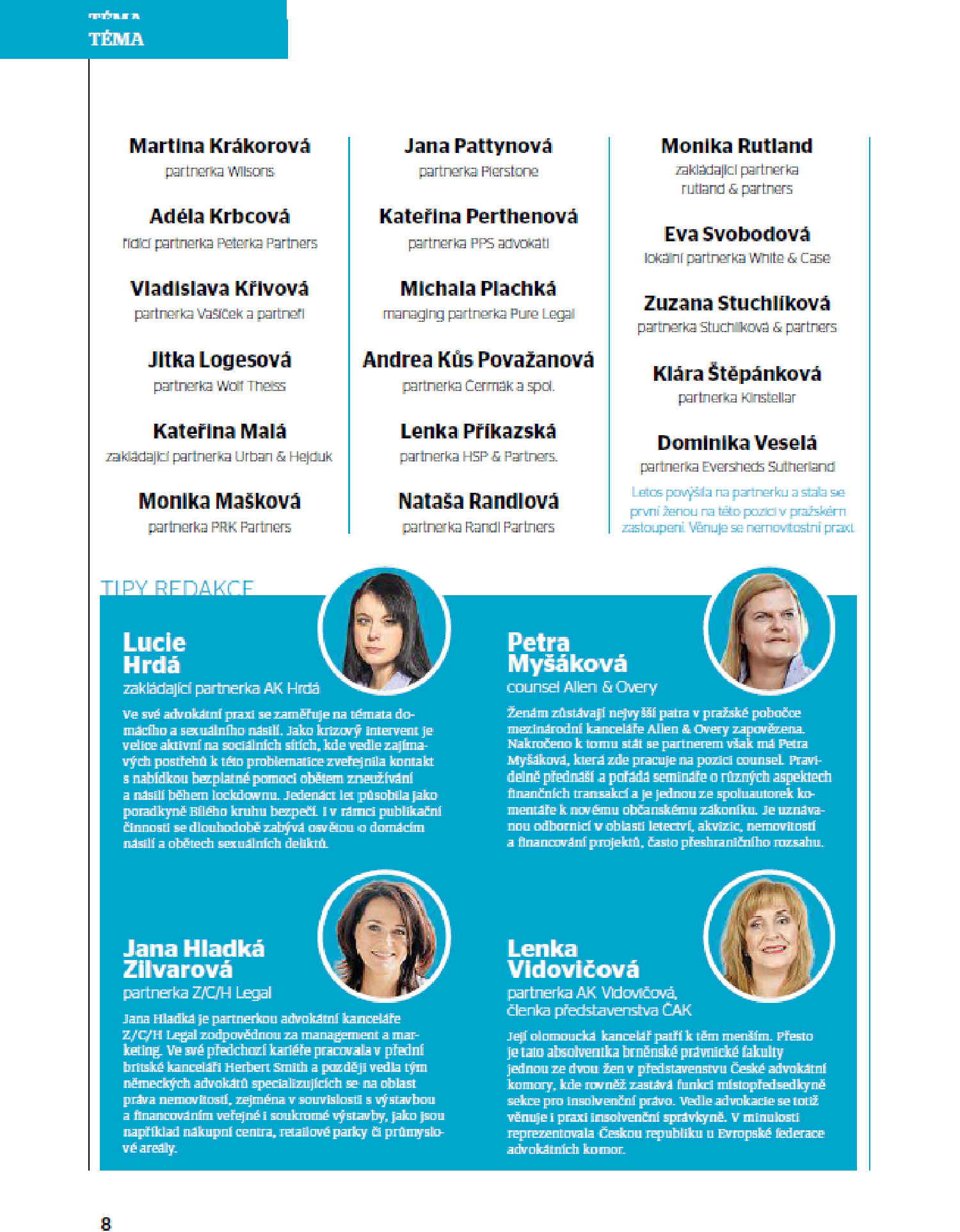 Zuzana Stuchlíková, a partner of our law firm STUCHLÍKOVÁ & PARTNERS was repeatedly included in the list of the most important women in Czech law, which is prepared annually by the magazine Právní rádce of the Economia publishing house.